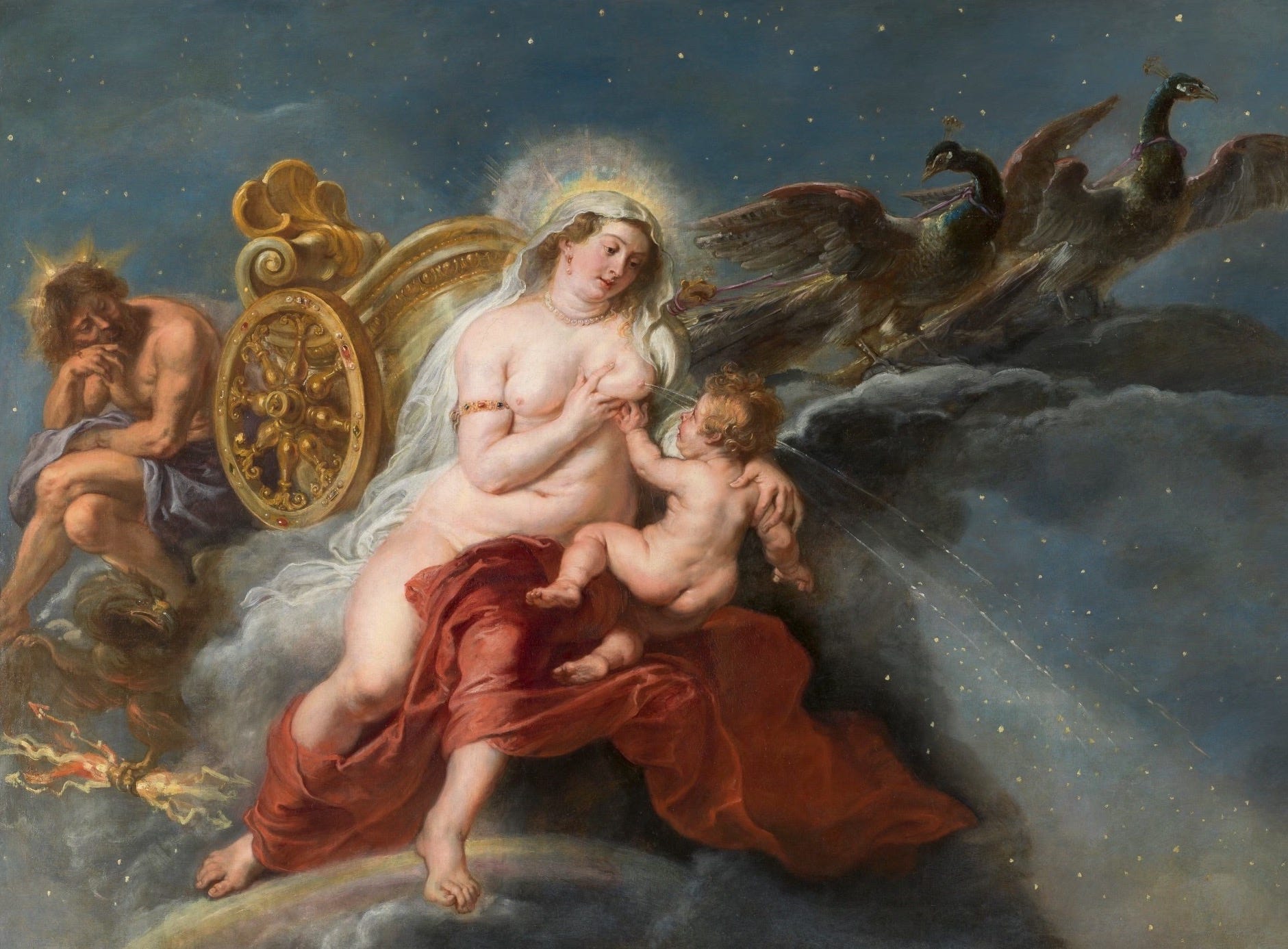 Easier to accept, maybe, is his differentiation between improvisation that produces “vulgar effects” and those that accompany “works with a more disciplined form.” When Rubens has Venus shoot breast milk at Cupid’s face in The Birth of the Milky Way, it occurs to the mind as vulgar for a moment. But then you see the broken arcs of white pigment transforming from lactation into shooting stars at the center of the painting. These dabbed streaks of white forming Venus’s streams of milk are like the yellow strokes depicting electric tatters of cornstalks that float on a series of broad, wet strokes of black and brown in the lower right corner of the Antwerp Adoration of the Magi. These improvisational gestures could have ruined the pictures bearing them. Instead, they give birth to a new apprehension of life.